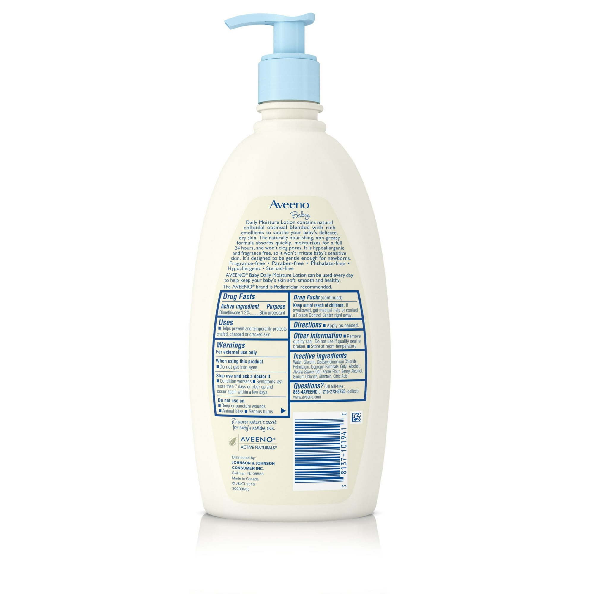 Aveeno Baby Daily Moisture Lotion with natural colloidal oatmeal features a nourishing, non-greasy formula that protects your little one's delicate skin and moisturizes for a full 24 hours. This baby moisturizing lotion is specially formulated to be gentle enough for babies. Natural colloidal oatmeal blended with dimethicone allows this oatmeal baby lotion to moisturize for a full 24 hours and helps prevent and protect chafed, chapped, or cracked skin. From a pediatrician-recommended brand, this hypoallergenic baby lotion can be used every day to keep your baby's skin soft, smooth, and healthy. The non-greasy formula is fragrance-, paraben- and phthalate-free so it won't irritate sensitive skin.