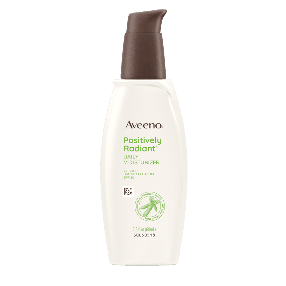 Even skin tone and texture and reveal naturally radiant skin with Aveeno Positively Radiant Daily Moisturizer with Broad Spectrum SPF 30 sunscreen. This facial moisturizer with sunscreen is clinically proven to improve skin tone and texture in just 4 weeks. This lotion formula, which contains exclusive Total Soy Complex, works to even tone and texture while fighting early signs of skin aging and reducing the look of dark spots. The Positively Radiant Daily Moisturizer is oil-free, hypoallergenic, and non-comedogenic, and it includes broad spectrum SPF 30 to help protect your skin from further sun damage. This oil-free facial moisturizer is wearable under makeup and leaves skin glowing. The Positively Radiant collection is designed to enhance your natural radiance and give you a lit-from-within glow. Each Total Soy Complex enriched product targets even tone and texture. Try other Positively Radiant products or explore other Aveeno collections for a skin solution that's positively you.