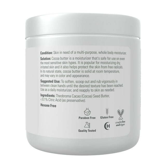 Condition: Skin in need of a multi-purpose, whole body moisturizer. Solution: 100% pure cocoa butter is a natural moisturizer that's safe for use on even the most sensitive skin types. It is popular for moisturizing dry skin and improving the appearance of blemished skin. In its natural state, cocoa butter is solid at room temperature, and may vary in color and appearance. Ingredient: Theobroma Cacao (Cocoa) Seed Butter. This product is naturally hard and color/texture will vary depending on temperature. Contains no fillers, preservatives, additives or artificial colors. No solvents are used during extraction.