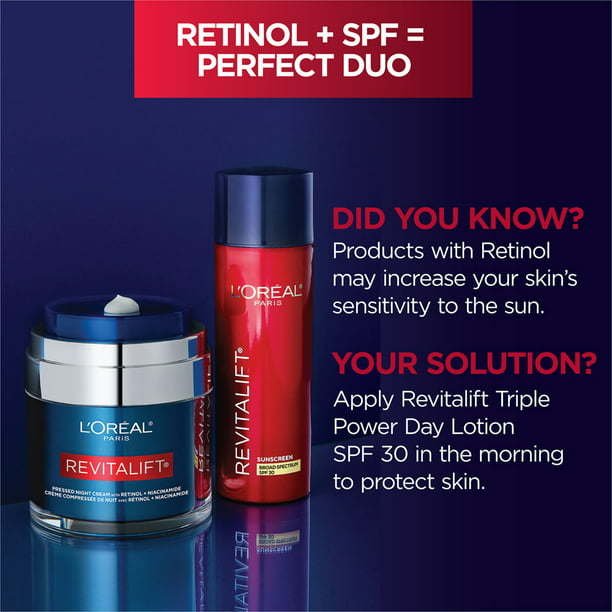 New Revitalift Pressed Night Cream with powerful derm-recommended duo Retinol + Niacinamide in our 1st fresh-pressed jar. It visibly reduces wrinkles, evens tone and deeply moisturizes. Retinol, Niacinamide and a complex of soothing ingredients are freshly pressed into a deeply hydrating yet lightweight night cream. Dermatologist tested for safety. Suitable for face, under eyes, neck and decollete. How It Works: Our new formula includes: Retinol [Vitamin A], a top dermatologist recommended anti-aging ingredient known to fight key signs of aging such as wrinkles and uneven skin texture. Niacinamide, Vitamin B3, an essential nutrient that strengthens skin's natural protective barrier and helps brighten skin overall, for a healthier looking complexion. 12% soothing complex of Panthenol (Vitamin B5), Glycerin, Hyaluronic acid and nourishing emollients to balance powerful Retinol and leave skin feeling deeply moisturized. What's New: The formula is packaged in L’Oreal Paris’ 1st fresh-pressed jar to protect the formula upon opening and to make it easy-to-dose. The Result- Overnight: Skin feels deeply moisturized, feels softer and smoother. Over Time: Wrinkles are visibly reduced. Contours on the face and neck are firmer, tighter. Complexion looks brighter, more even and radiant. Overall, skin look healthier and younger. Skin is hydrated for up to 24 hrs. New L'Oreal Paris pressed night cream is Fragrance free, Allergy tested, Paraben free, Dye free and Mineral Oil Free. Does not clog pores. Suitable for all skin types. See results or your money back, guaranteed. Money back guarantee, up to $36.99 (sales tax will not be refunded). Restrictions apply. For details, call 1-800-630-5585. Valid in the 50 U.S/D.C. Void where prohibited. Limit 1 refund per person and per household. Not Applicable