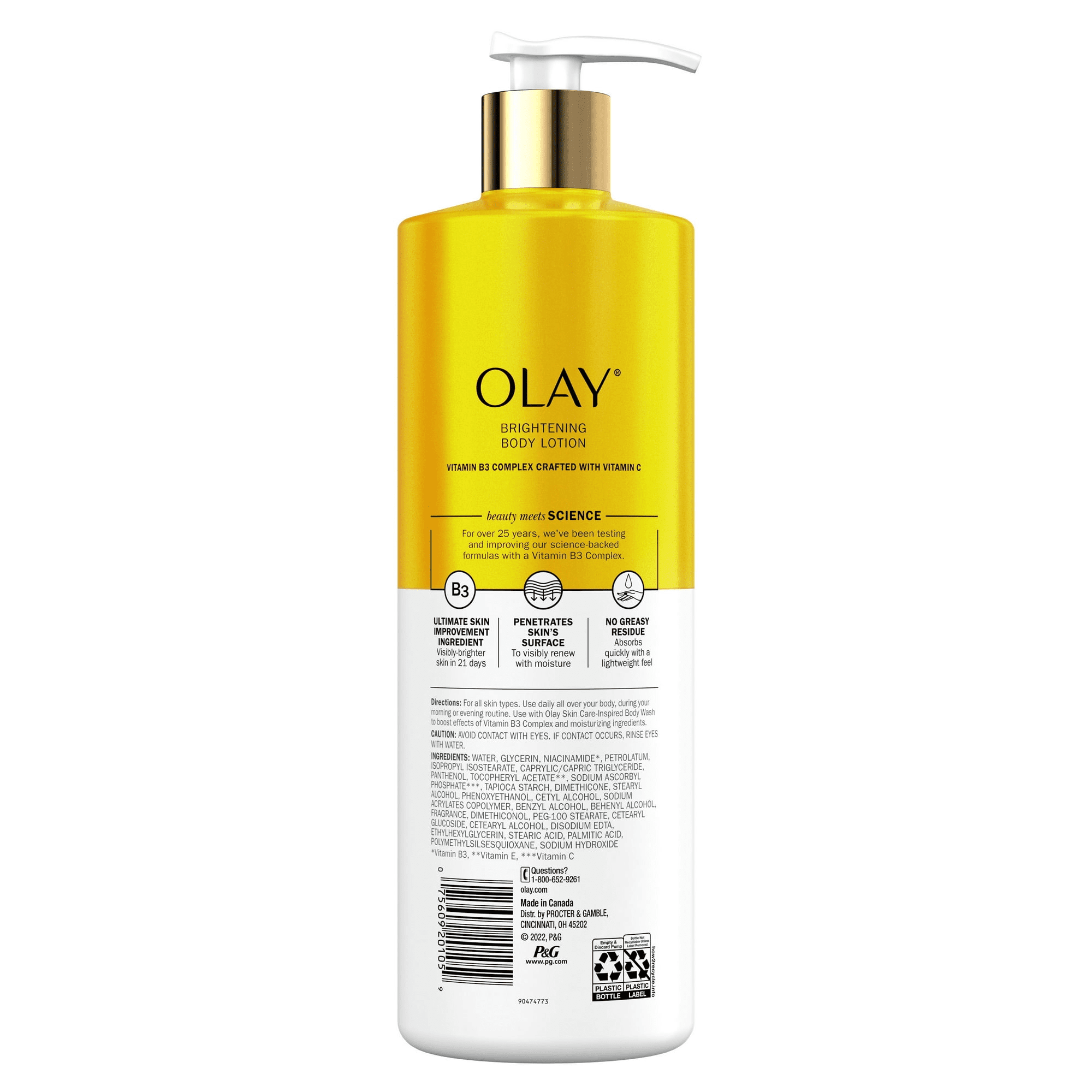 Who wouldn't want more radiance? Brighten up dull skin with olay revitalizing & hydrating body lotion. This moisturizing lotion has a nutrient-rich formula crafted with vitamin c and our vitamin b3 complex and was created specifically to give your skin a boost of rejuvenating hydration from head to toe. Why add vitamin b3 complex into your routine? It's the ultimate skin-moisturization ingredient. Vitamin b3 allows your skin to hold on to water so it can become its own moisturizer. It also leaves you with skin that looks younger, feels softer, and looks smoother. Watch your skin's visible transformation without worrying about the greasy residue other types of body cream can leave behind. This body lotion also absorbs quickly, penetrating deeply into the skin's surface, leaving your skin with long-lasting smoothness and increased surface cell turnover. Make sure you take a minute to appreciate its lovely packaging-it's worthy of a prominent spot on your vanity. Use daily all over your hands and body during your morning or evening routine. Use with olay skin care-inspired body wash to boost effects of vitamin b3 complex and moisturizing ingredients.