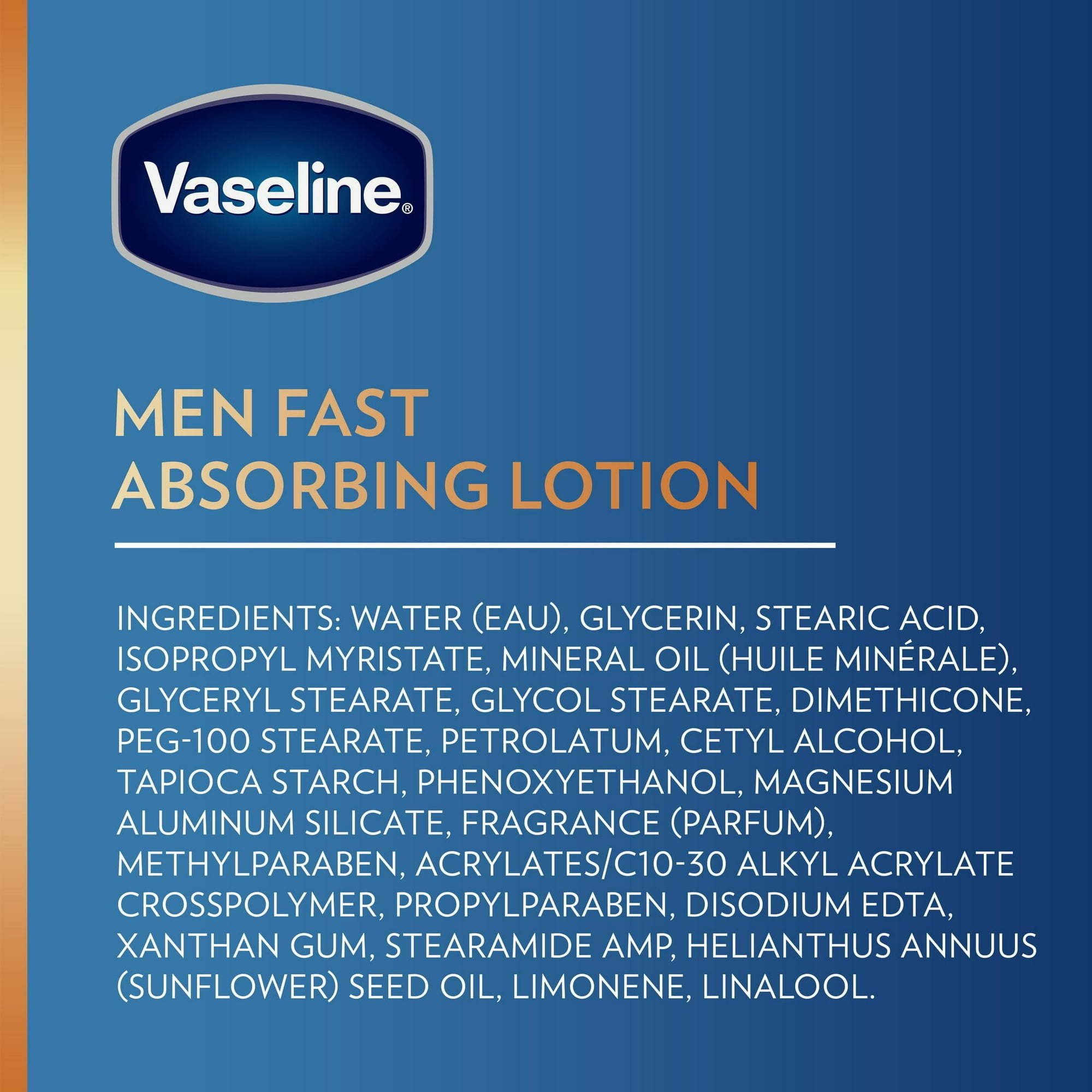 NON-GREASY FEEL: Vaseline® Men Fast Absorbing Body Lotion absorbs into your skin in 15 seconds to provide immediate moisturization without making your skin feel greasy
